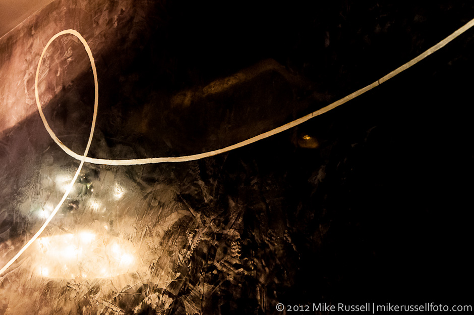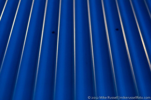 You know that time of the evening, well after the sun has set but before it’s completely dark? My wife loves the color of that sky. This is that color lighting the corrugated metal overhang just beneath a second floor window.
