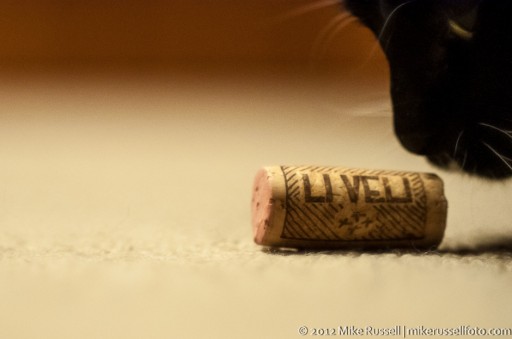 I started by just shooting the carpet and seeing the very thin line that was in focus. But then decided to throw in a cork to give it a little more context. And just as I was taking the first shot, our little curious cat had a sniff.