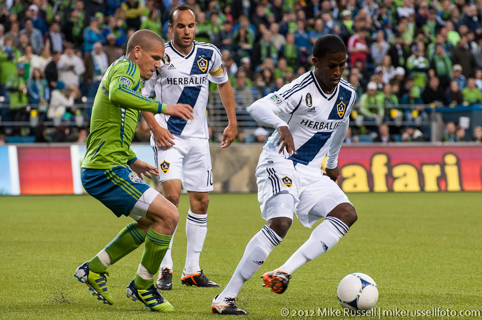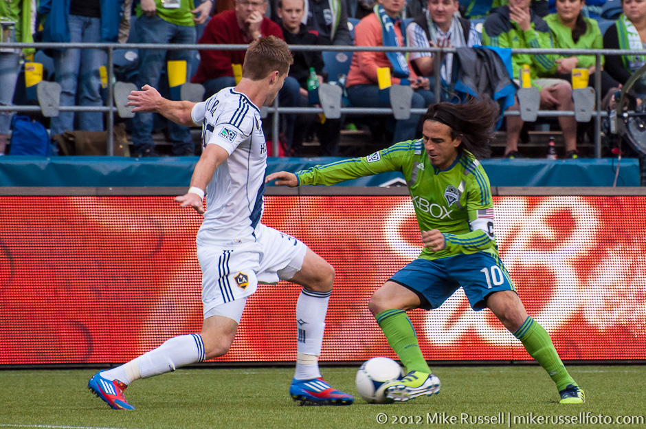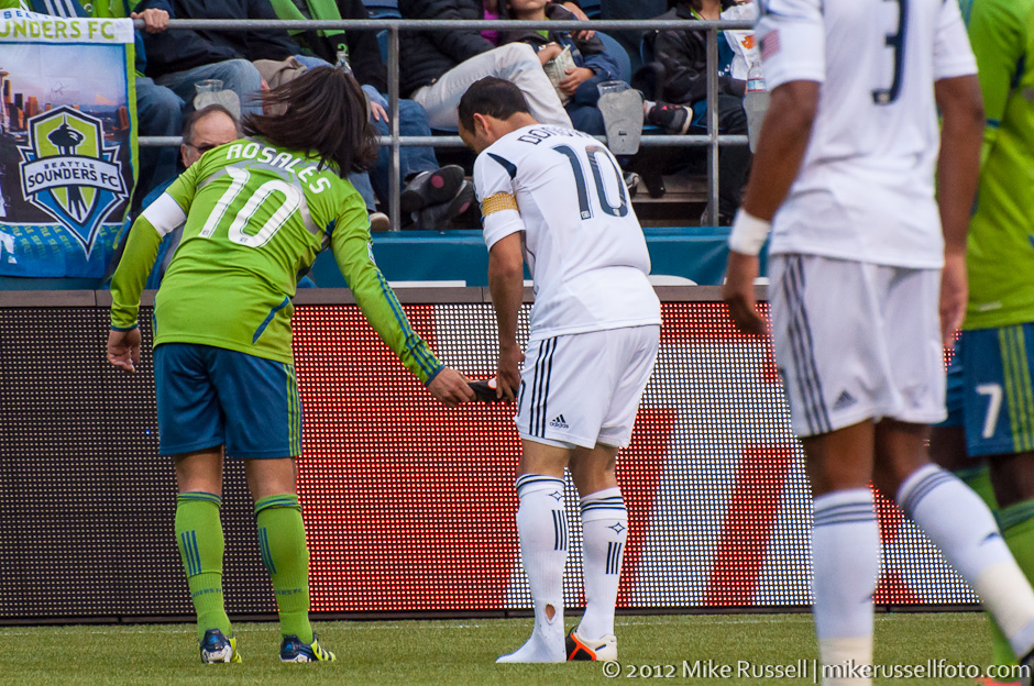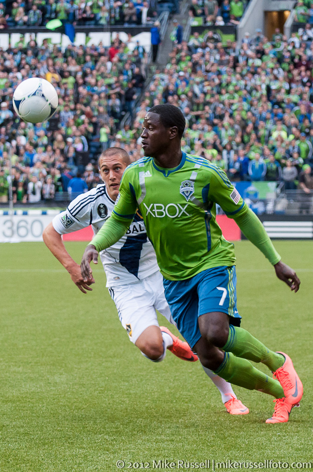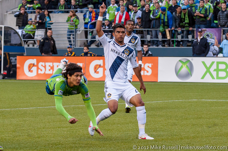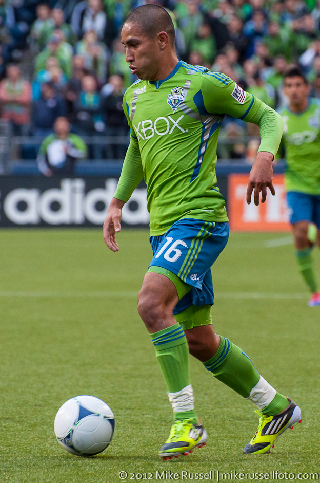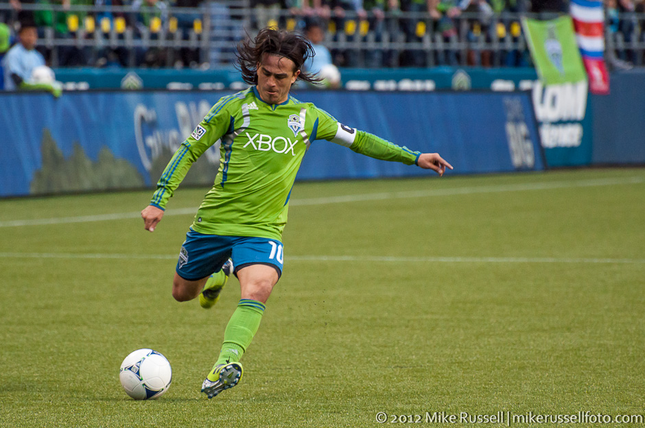 I was little late getting down to the pitch after uploading some first half photos to Prost Amerika. In order to get to the North side of the field where I was planning on shooting, I had to walk through the back halls of CenturyLink. (They don’t let photographers walk along the sidelines to switch ends during the match.) And of course, while I’m in the bowels of the stadium I hear a huge eruption from the crowd. I made it onto the pitch just in time to see the replay of Fredy Montero’s amazing strike from distance.
