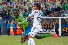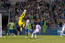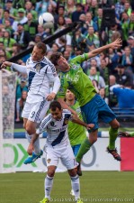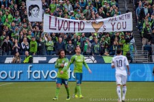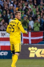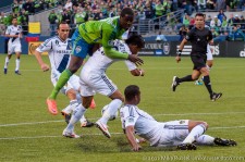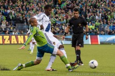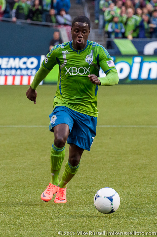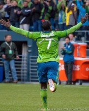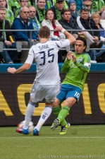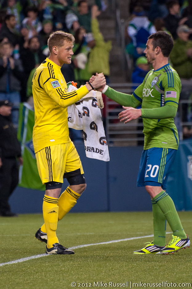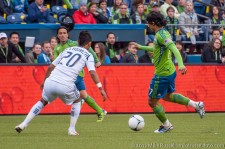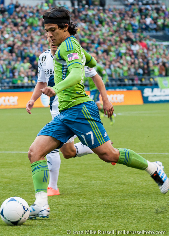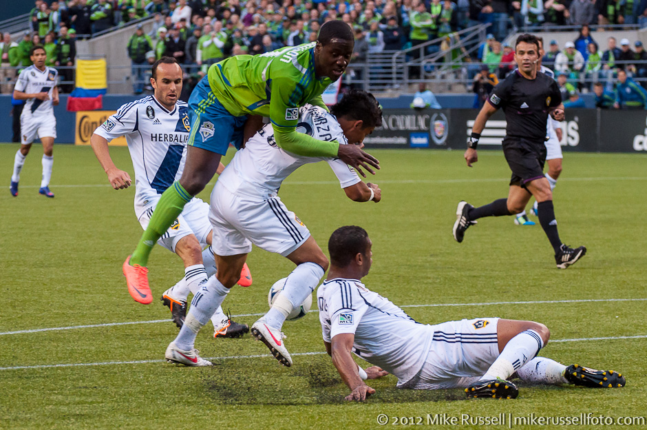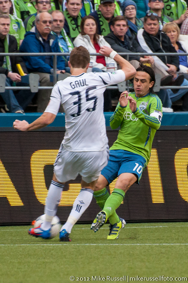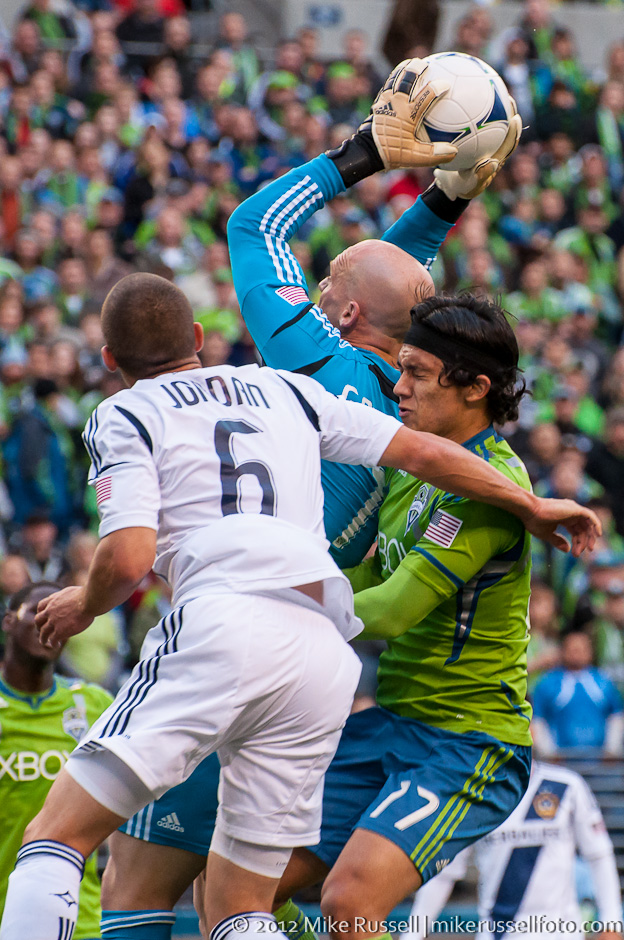 I was little late getting down to the pitch after uploading some first half photos to Prost Amerika. In order to get to the North side of the field where I was planning on shooting, I had to walk through the back halls of CenturyLink. (They don’t let photographers walk along the sidelines to switch ends during the match.) And of course, while I’m in the bowels of the stadium I hear a huge eruption from the crowd. I made it onto the pitch just in time to see the replay of Fredy Montero’s amazing strike from distance.