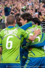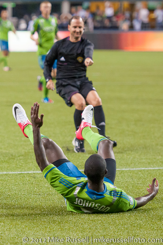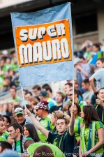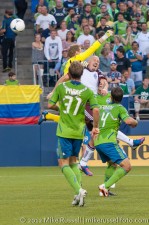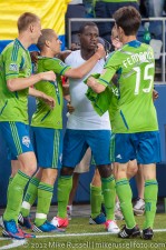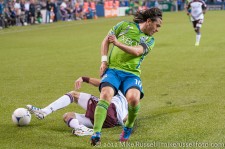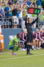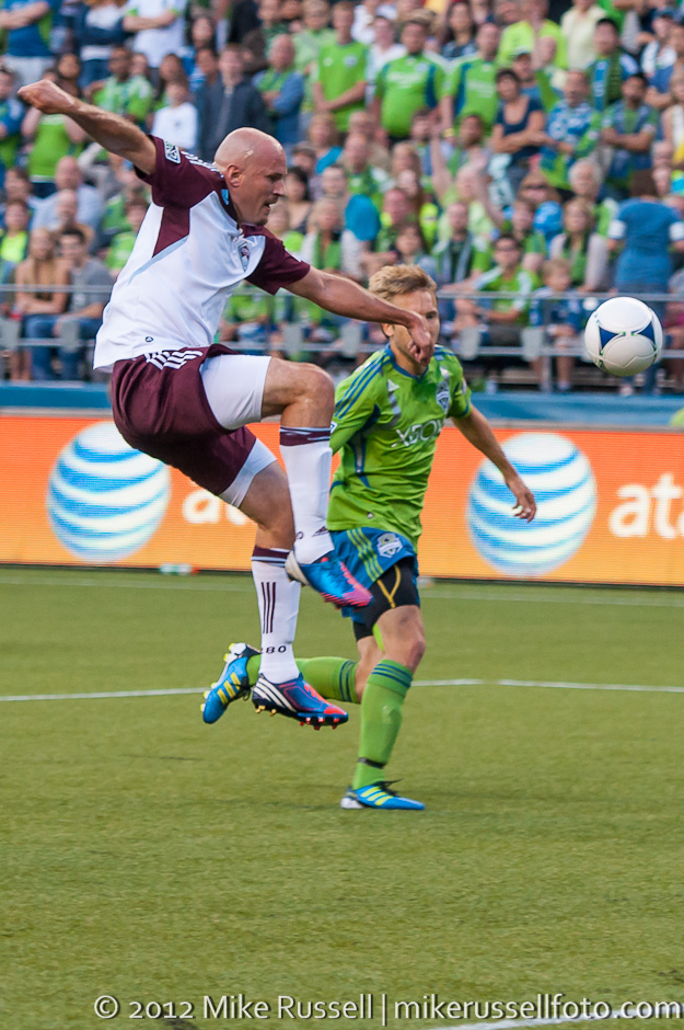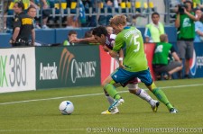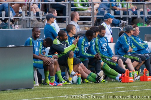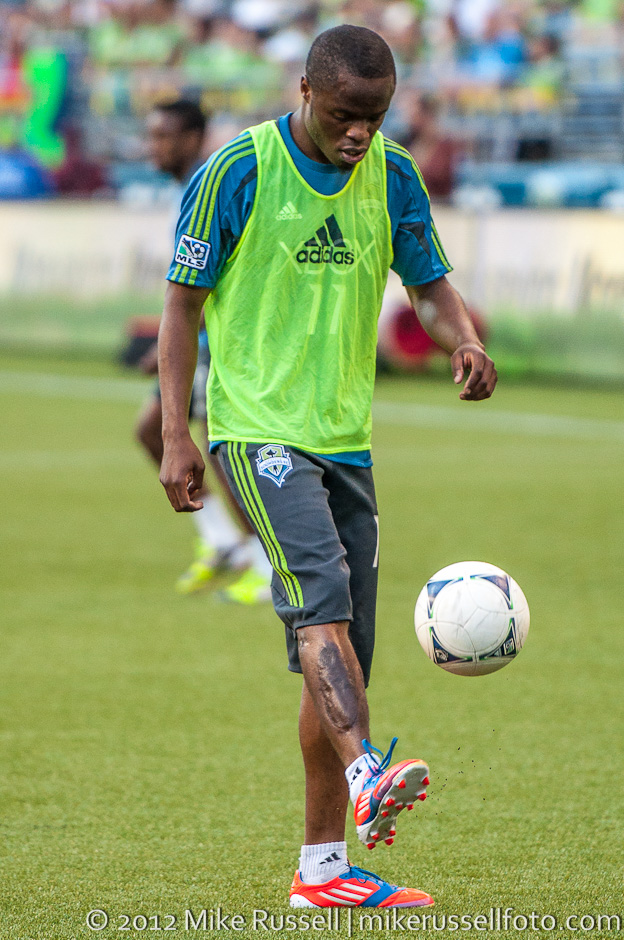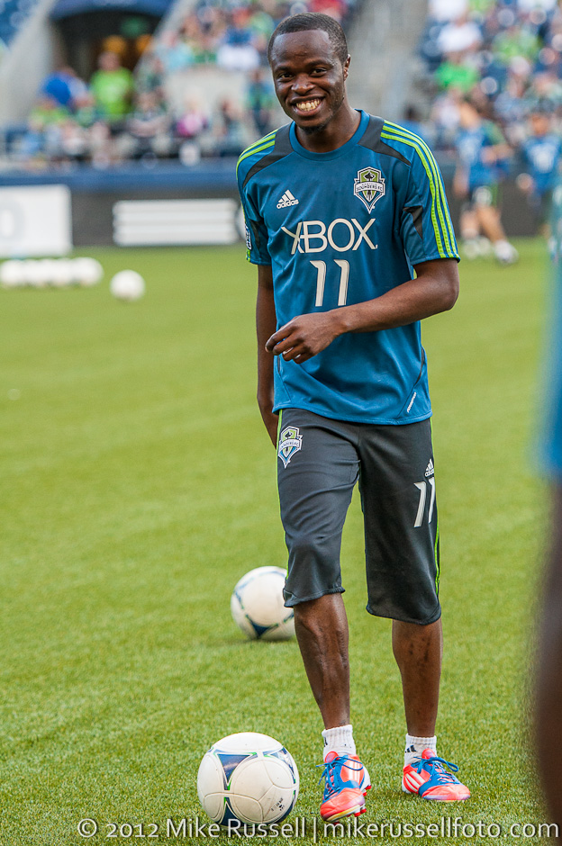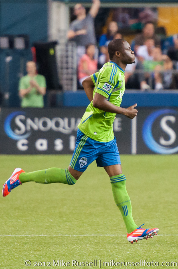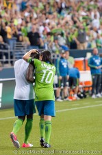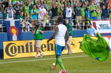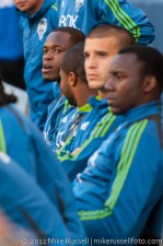 I was shooting down at the Brougham End, in front of where the Sounders substitutes warm up. Before Steve got the call, you could tell that he was amped and itching to get out there. In between warm up exercises, he’d stand next to me with a firm hold on the advertising board, bouncing up and down, keenly watching the action on the pitch.