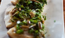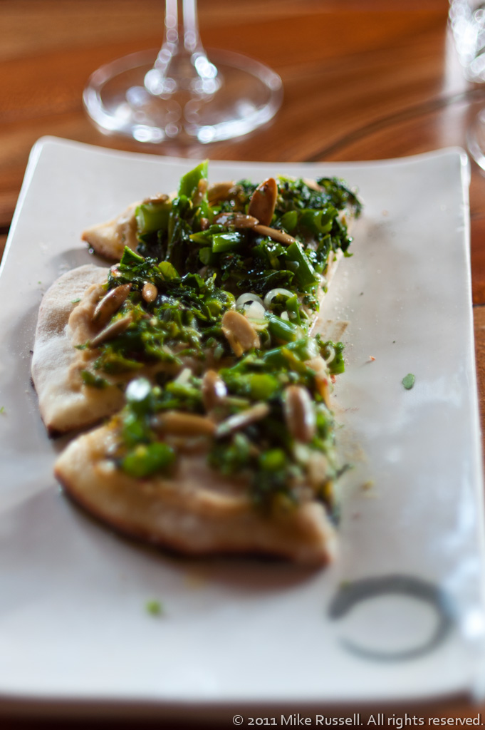 Sicilian flatbread w/chickpea, marinated kale rapini & pepitas. Served with Castello Carboncine Brut D.O.C. Prosecco from Treviso, IT.