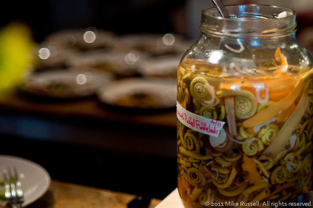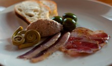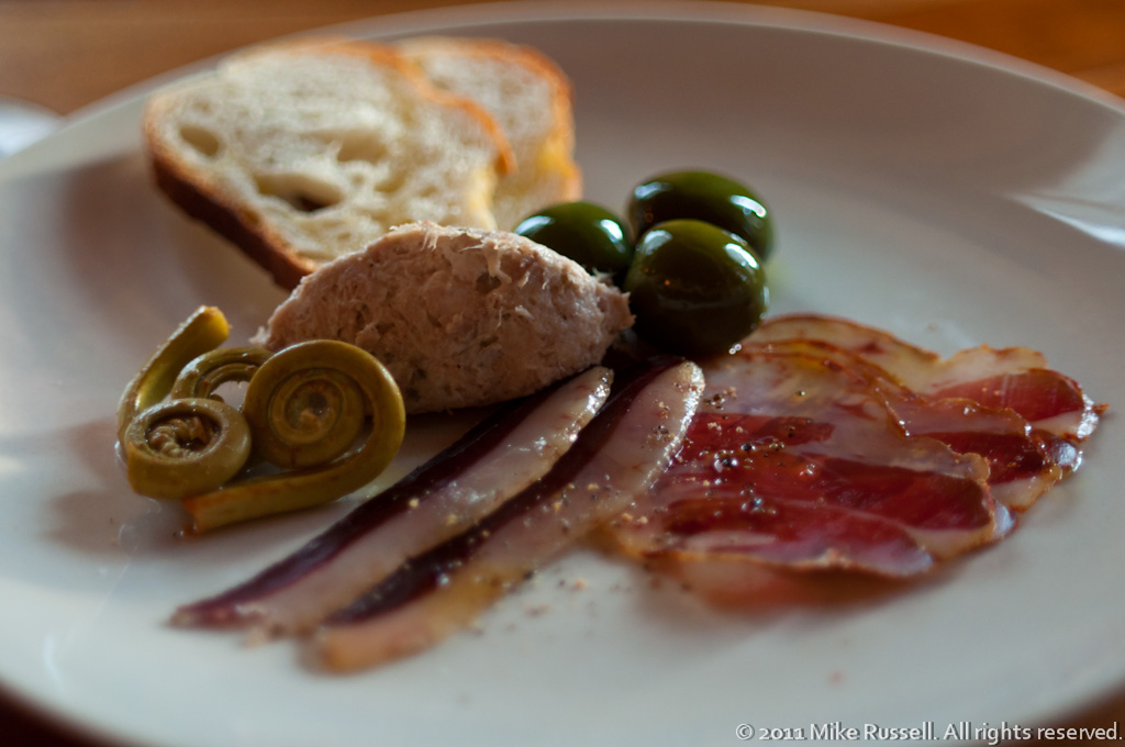 Duck ham, coppa, pork ciccoli, pickled fiddlehead ferns, marinated Castelvetrano olives. Served with Alois Lageder Lagrein Rosato, 2009 from Alto Adige, IT.