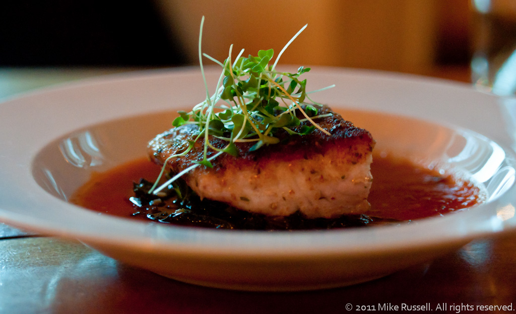 Parmesan and oregano-crusted wild sturgeon, tuscan melted greens, smoked tomato brodo. Served with Giribaldi Barbera d’Alba, 2009 from Piemonte, IT.