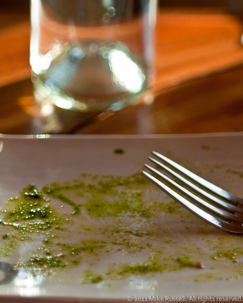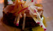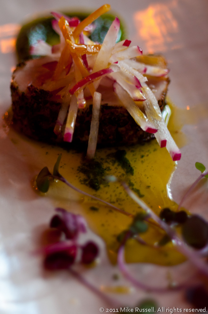 Albacore tuna, fennel pollen, preserved lemon, radish, arugula pesto, and 2009 Borgo Scopeto EVOO. Served with Castello Carboncine Pinot Grigio, 2009.