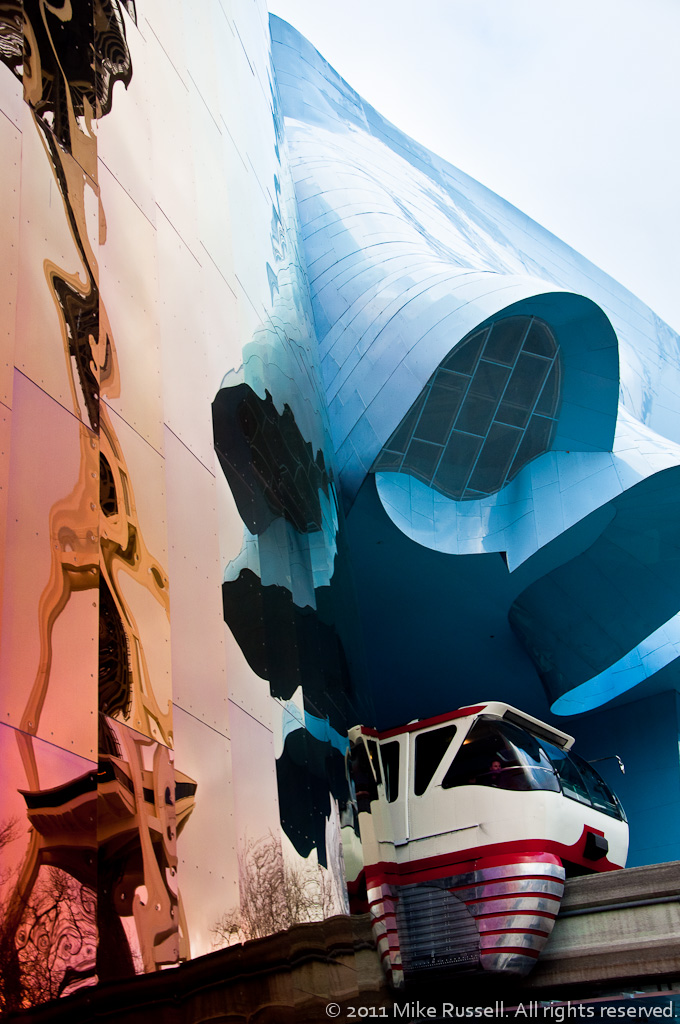 Last week I finally made it down to EMP with my camera. It was a lot of fun playing with colors and shapes. But one of my favorites out of the series was this one which includes three of Seattle’s iconic images all in one – the Space Needle, EMP, and the Monorail.