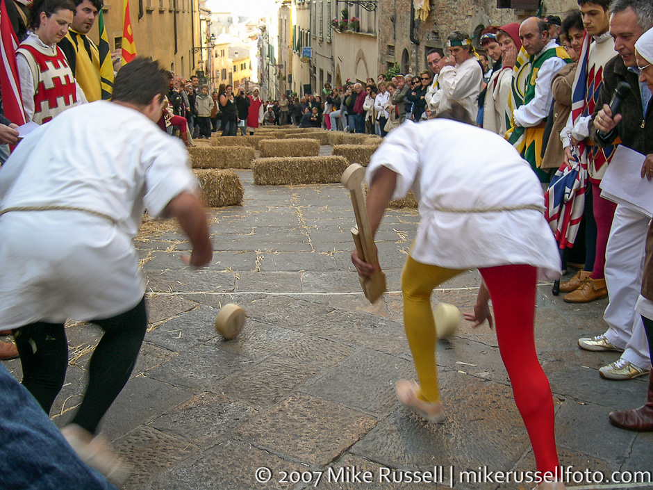 But what festival is complete without the local contrade dressed in medieval attire competing in a pecorino race? Yep, it was a first for me, as well. The idea is pretty simple as far as I could tell, you roll the wheel of pecorino down the hill, using only a wooden paddle to guide it around the bails of hay. First one down, wins.