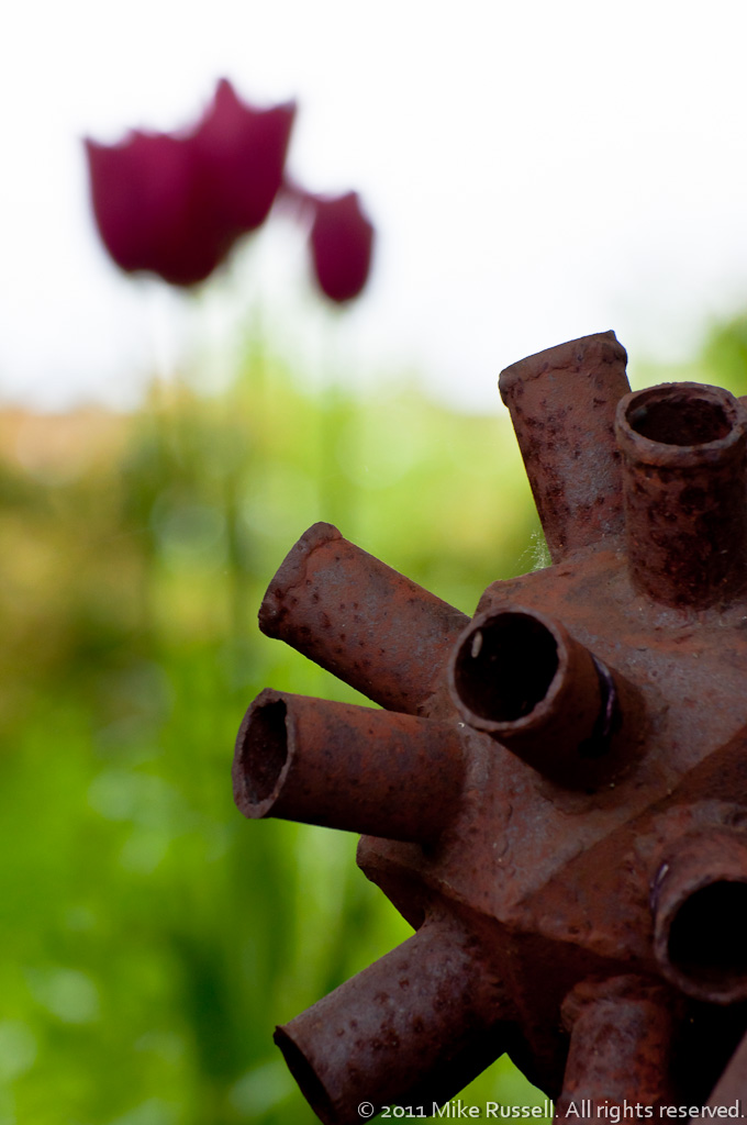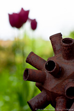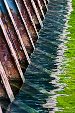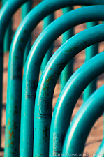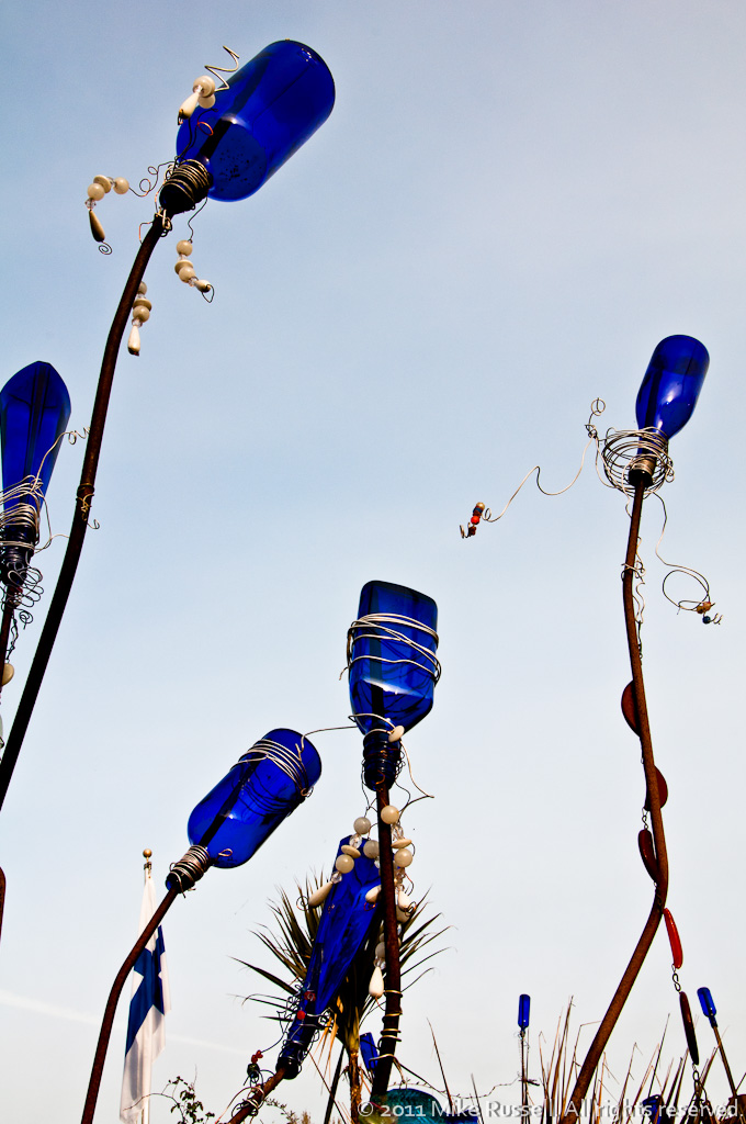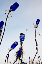 The symmetrical and repetitive designs found in both man-made and natural objects catch my eye. I notice the rusty pilings of a pier. A bike rack on a beach captivates my attention, its lines curving and straight. The mysterious silhouette of a grove of trees just past dusk enchants me. I find myself fascinated by the layers in the petals of a water lily, the leaves and their rust-tinged edges. The color and curves of a “garden†of whimsical bottles transports me to a surreal, otherworldly landscape.