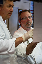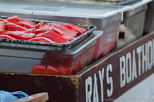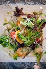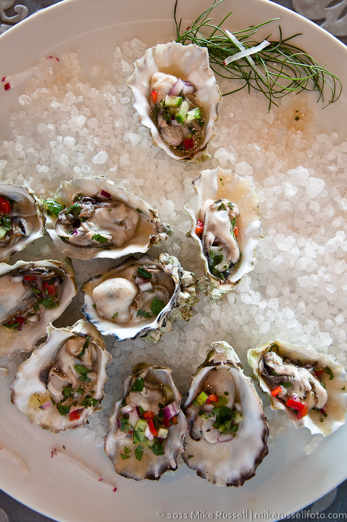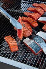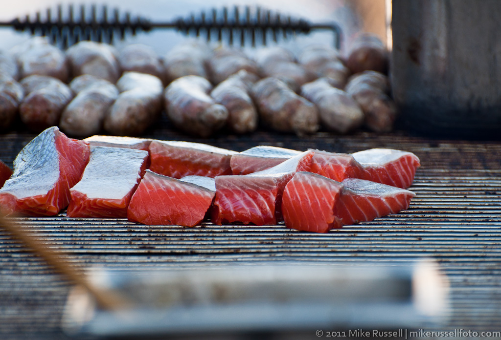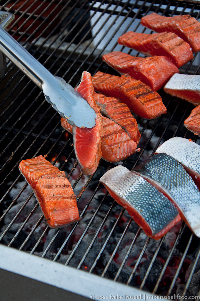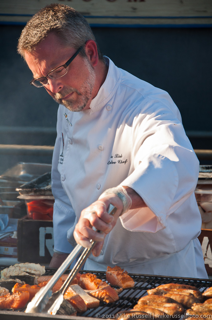 While most of the food was prepared in their banquet kitchen, Executive Chef Peter Birk was stationed at the grill out on the deck. The grill was surrounded by plenty of spark-catching sand to prevent a third fire to the 38 year old restaurant. It was great to watch Chef Pete in action grilling up the Chinook and Sockeye salmon from the Copper River as well as (I believe) Chinook from the Columbia River.