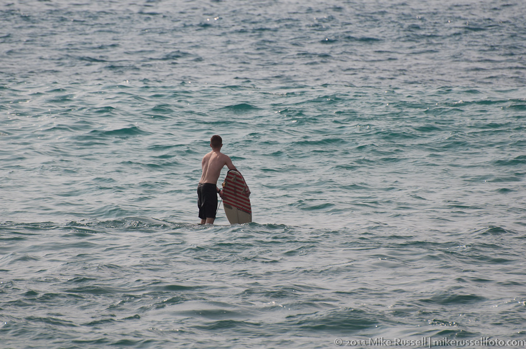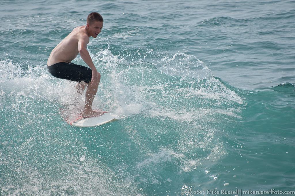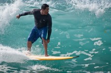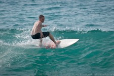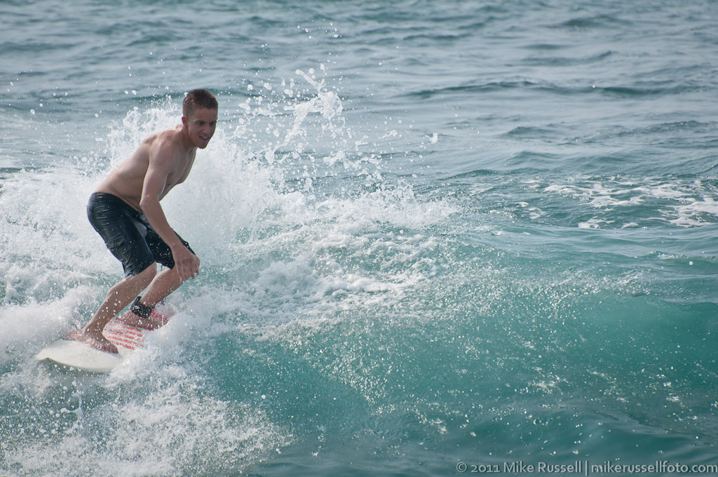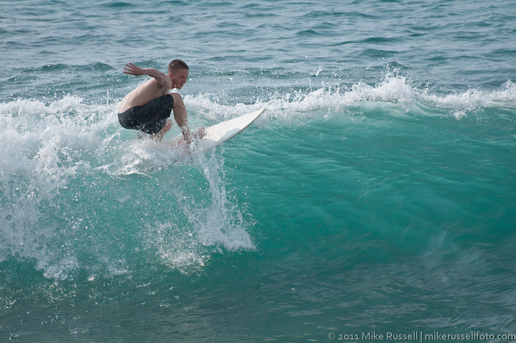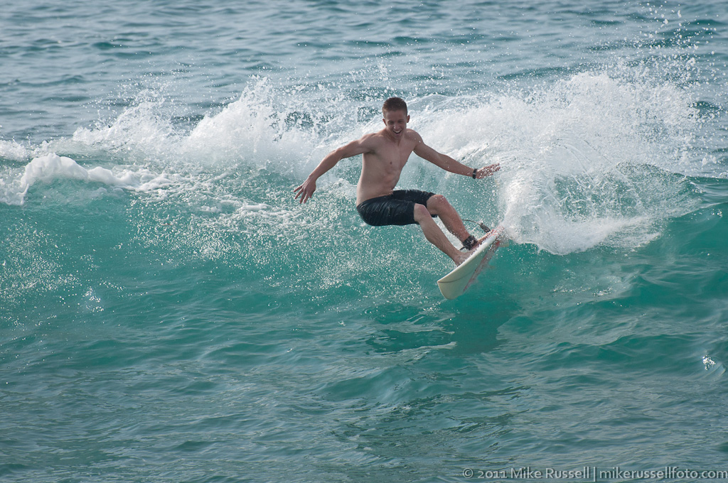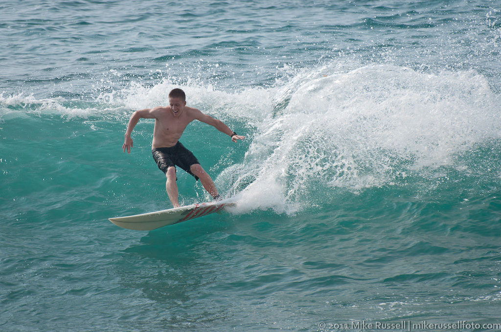 What makes for a bad snorkeling day, makes for a great day to surf. Our attempts to snorkel were thwarted twice today by big surf. But there were dozens of surfers and people on boogie boards in any cove that had decent waves.