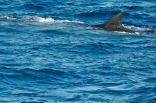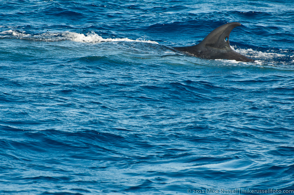 About 30 minutes pass before we reach the fishing vessel that reported the sighting. A fin broke through the surface and Captain Dan informed us that it’s a humpback on its side and the tip of its tail. But then a few more similar fins emerged and a couple others spouted. Even I could tell these were not humpbacks.