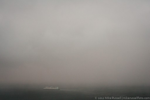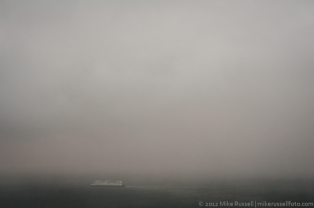 The light was fading fast and a ferry was disappearing into the snow. I wanted to switch lenses, but knew I wouldn’t have time. The photo below is the end result.